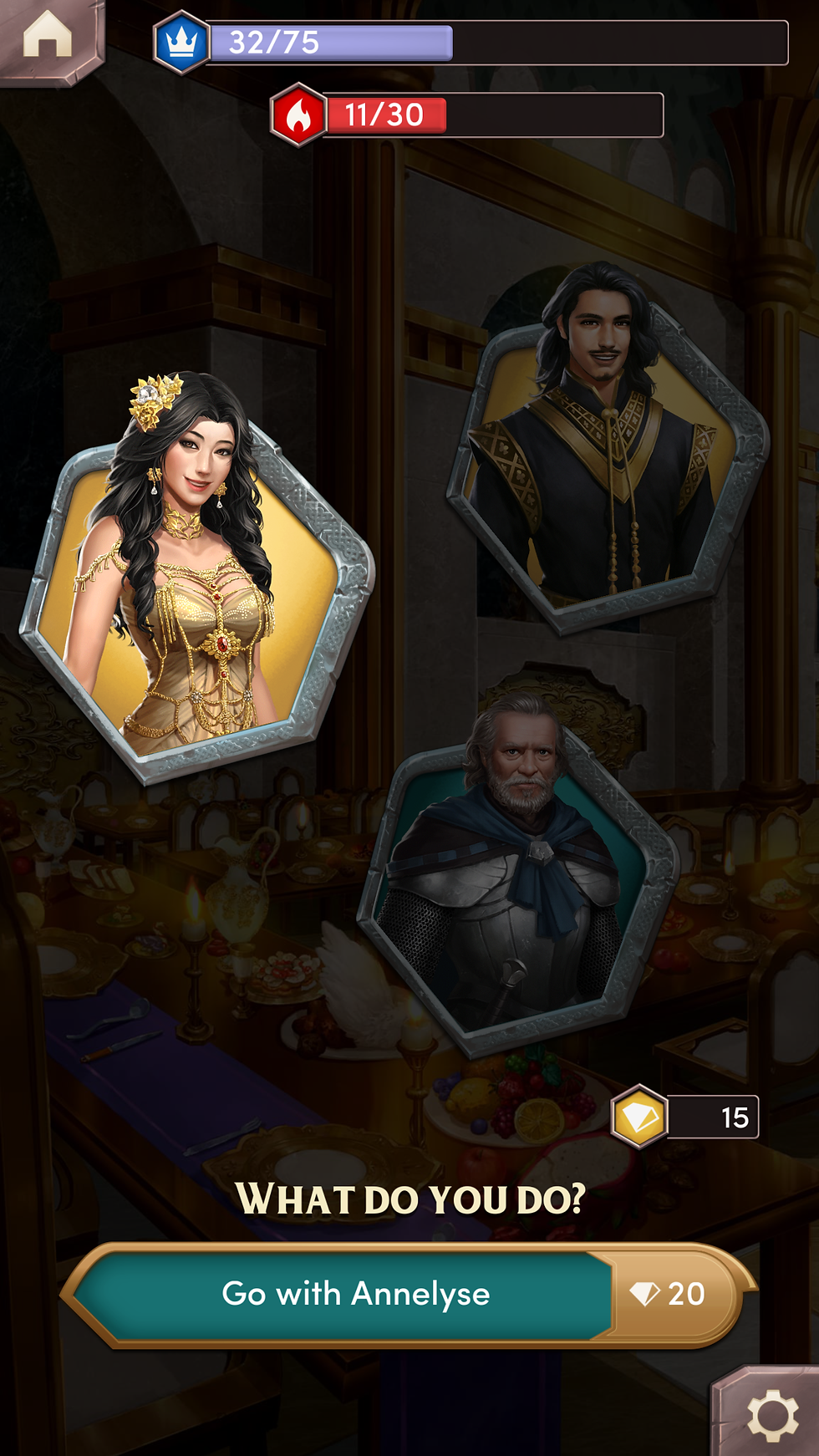 Decisions players make will determine their special traits that may affect the development of the story (in some instances as with the character-story developments within The Crown & The Flame). Yet, some decisions cost real cash, or a lot of playing time. After completing a chapter, players receive a diamond which helps unlock special decisions. If a player wants to make a particular special decision: a player may play other chapters in other stories until earning enough diamonds for a special decision of their choice (--in their current-main story with the special decision a player has been saving up for).